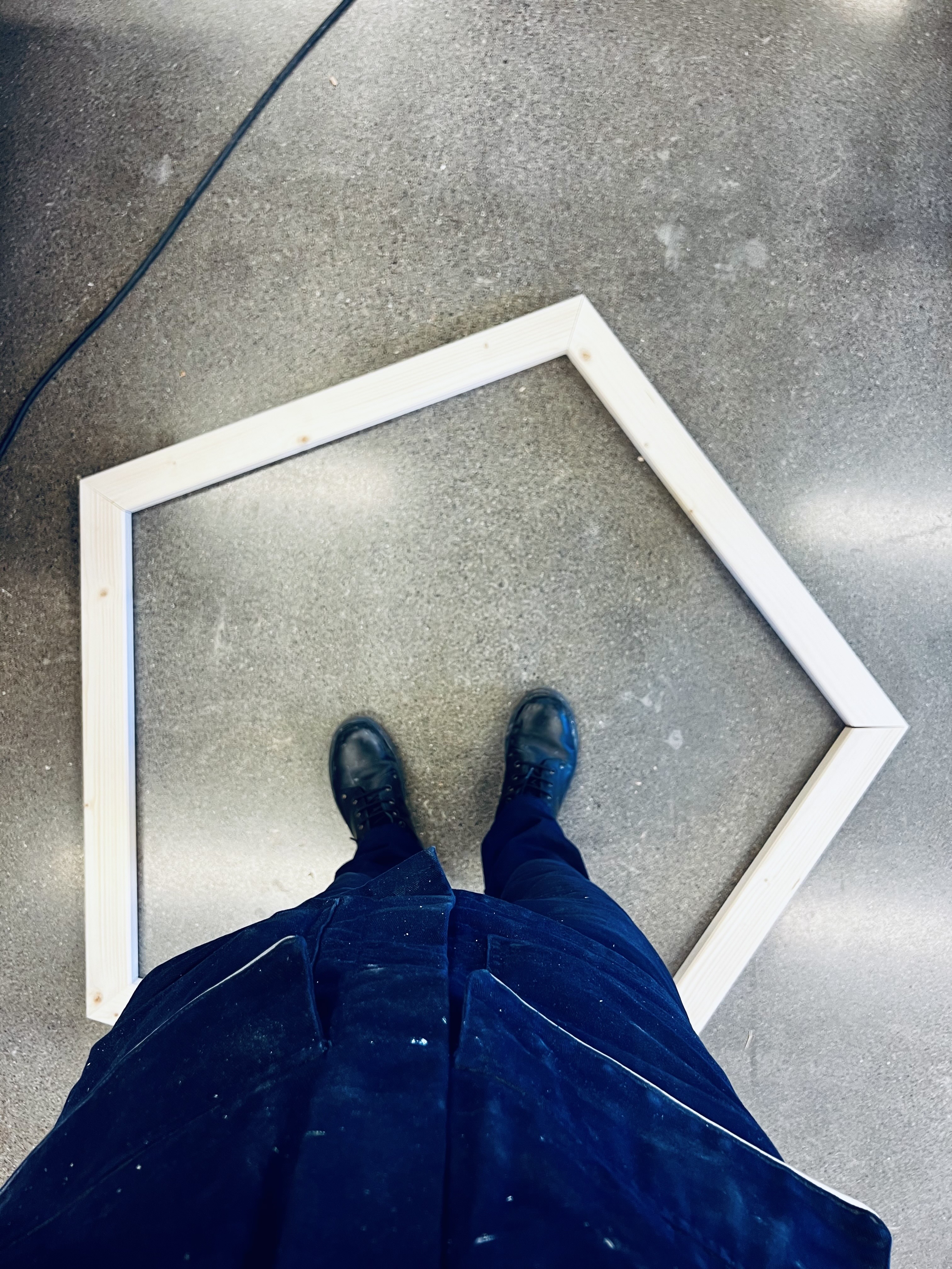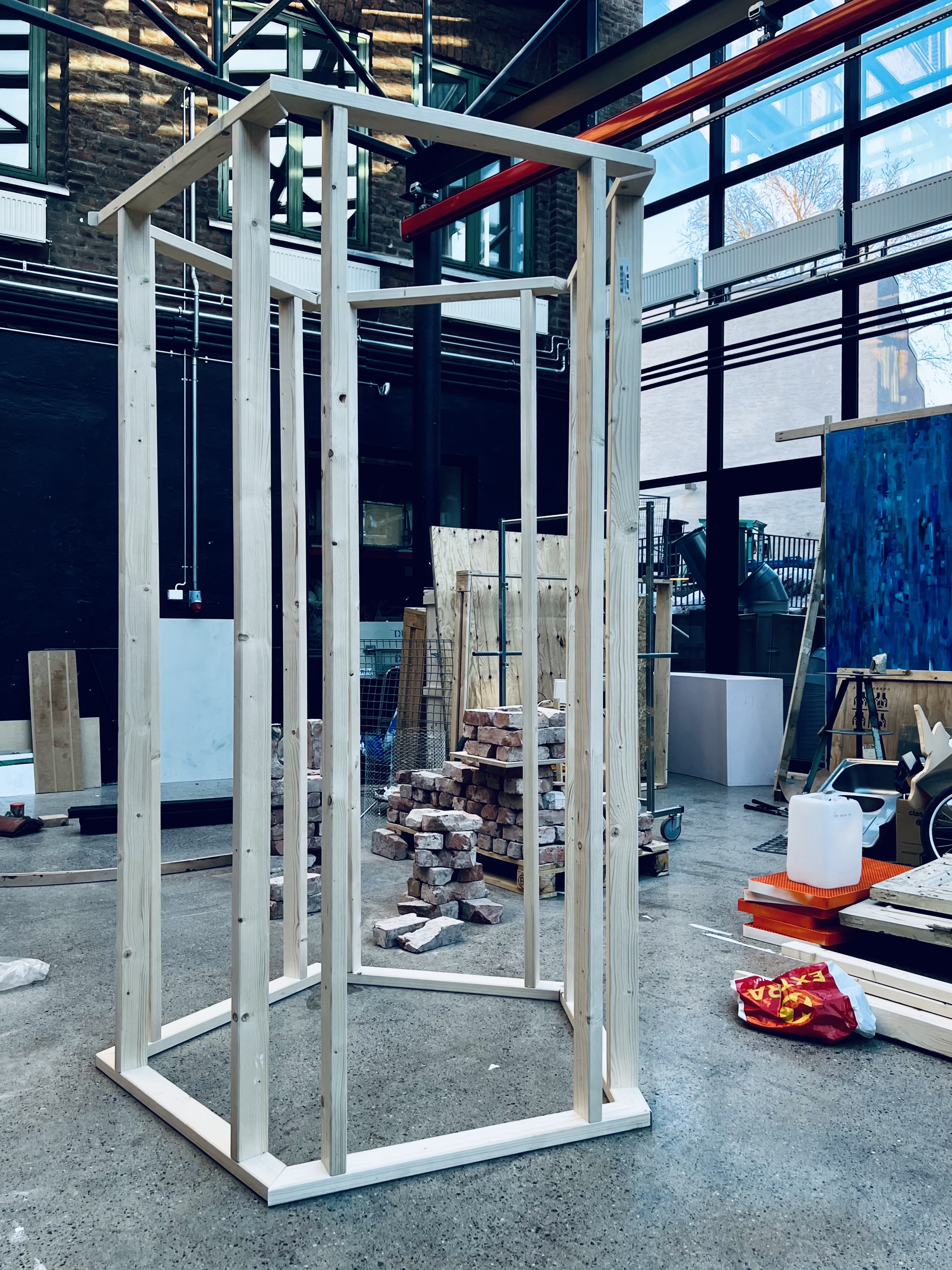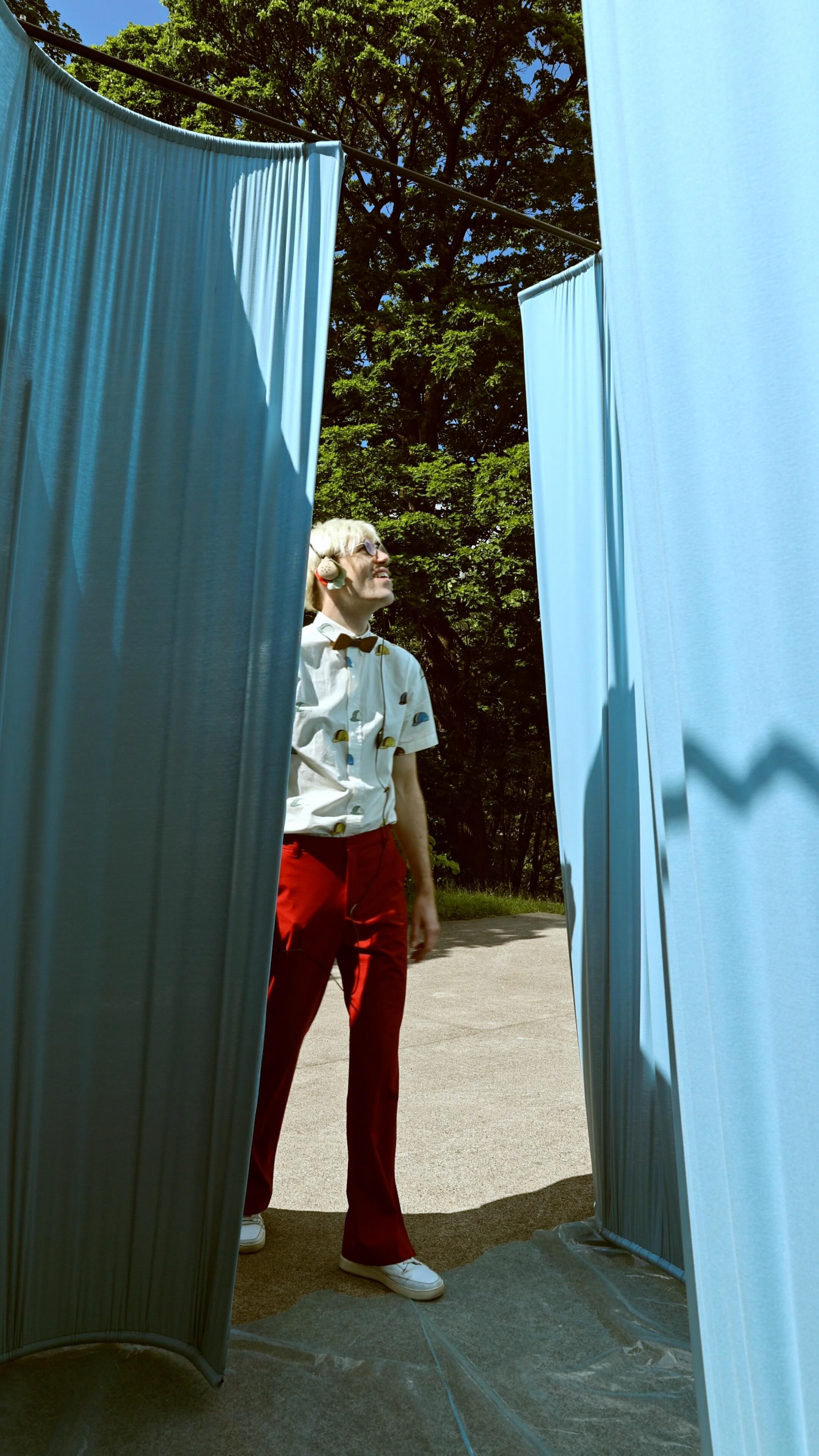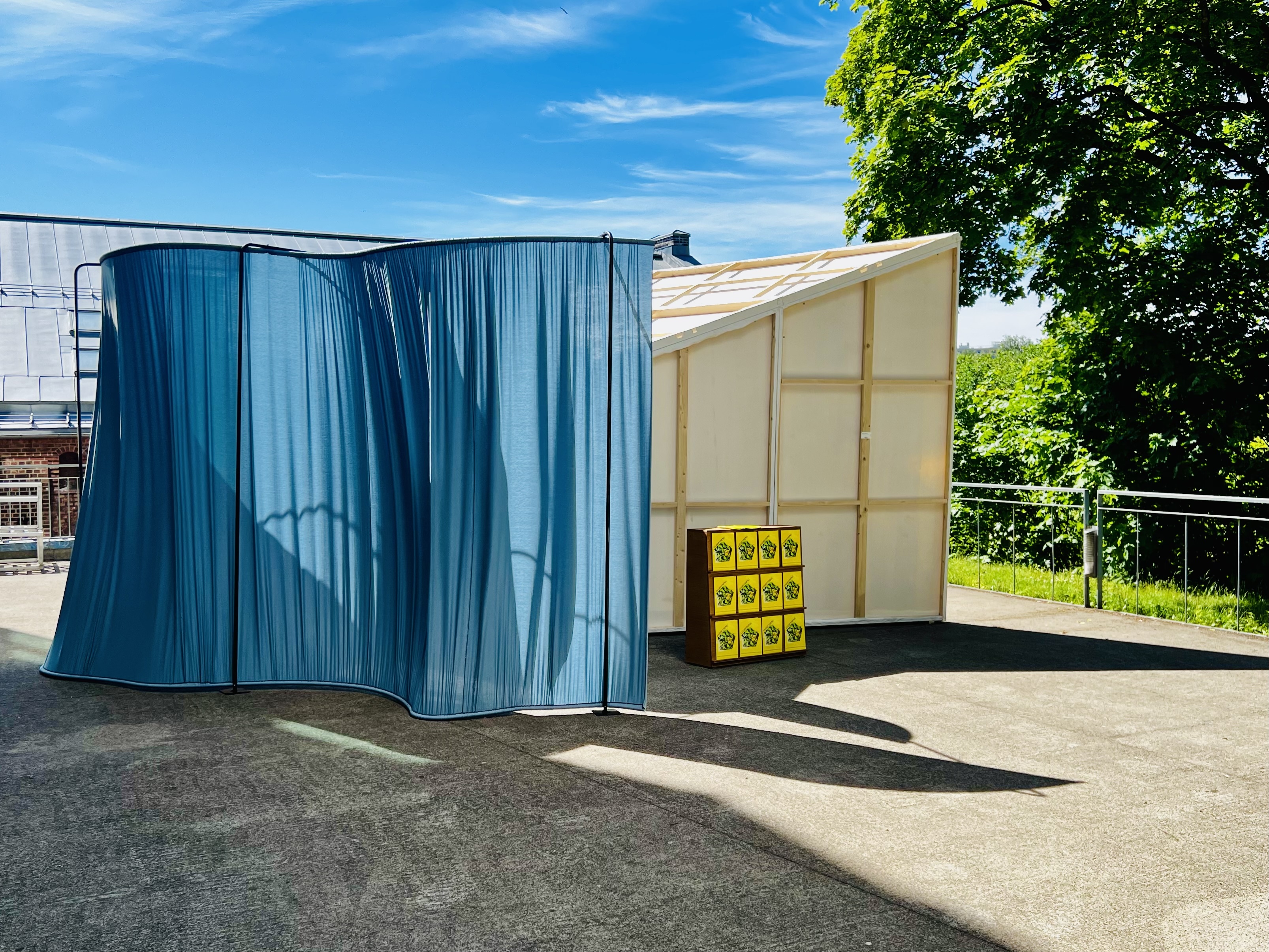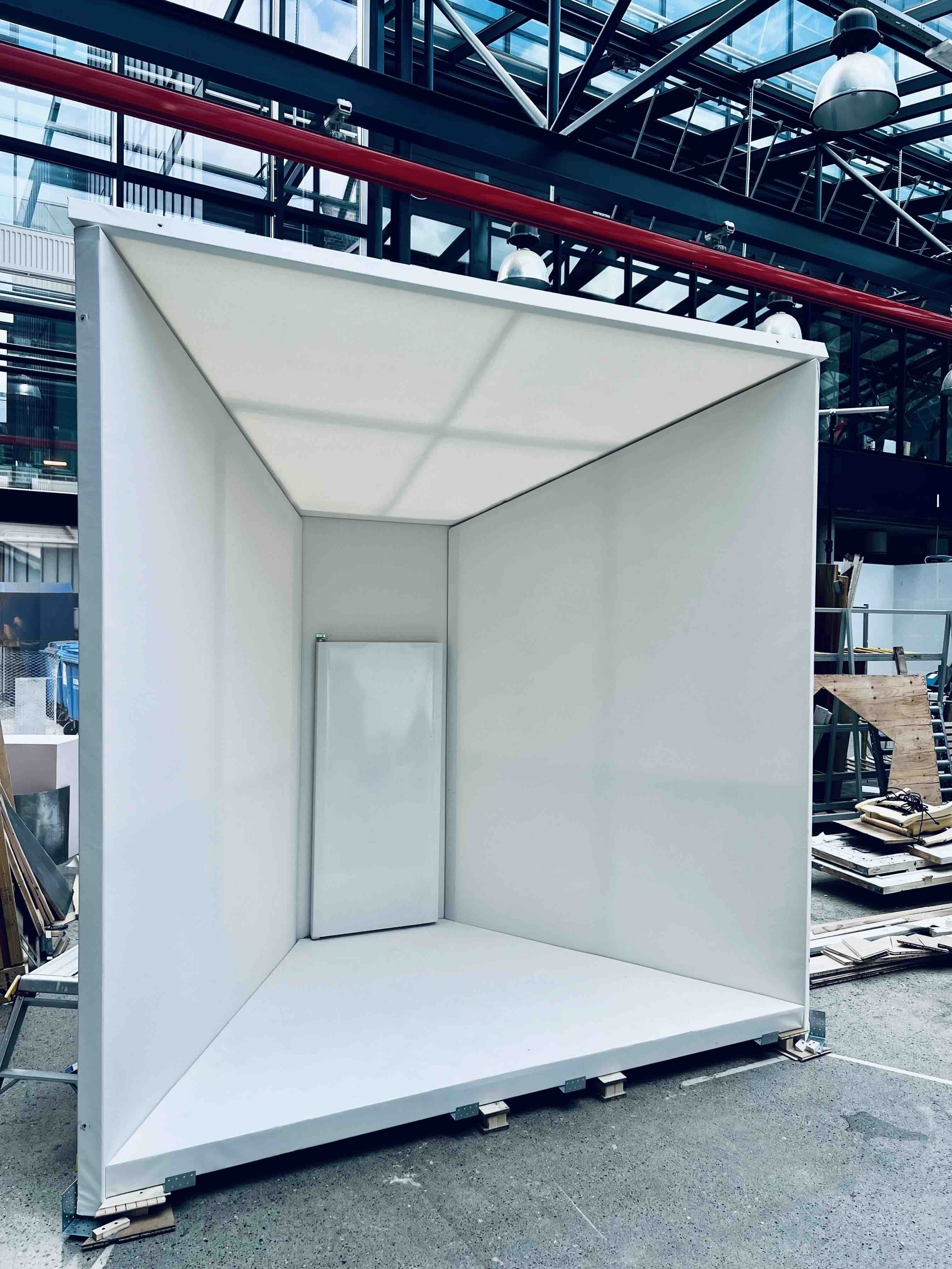 The installation manifests in the loose shape of a five room pentagon, including a spiraling pathway, making the guest circle into the center where they find closure and from where they get launched out into the world again.