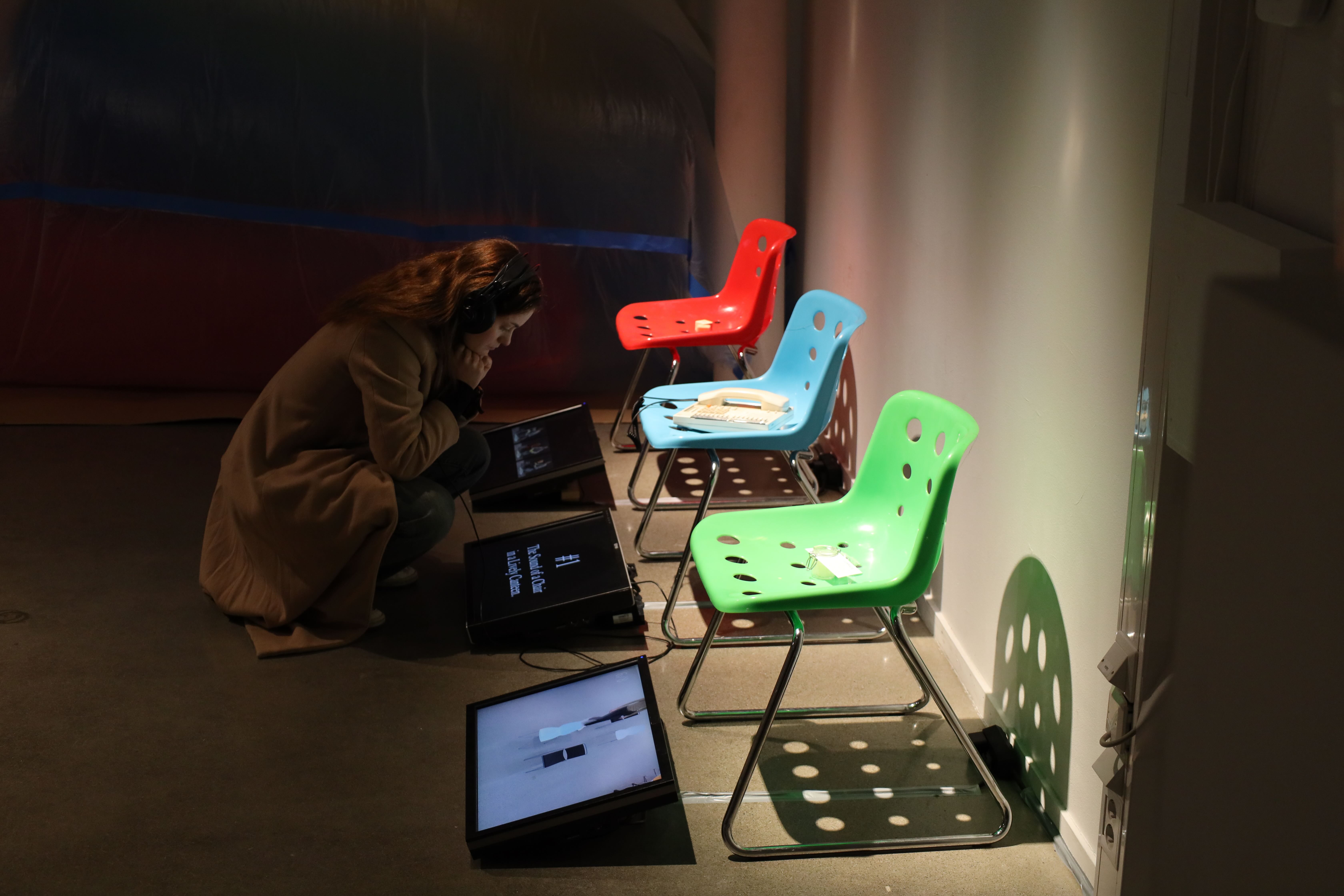 Recording the sound of falling, ringing, touching chairs. Then distilling parts of chairs to harvest their smell. And finally baking the taste of chairs into waffles.